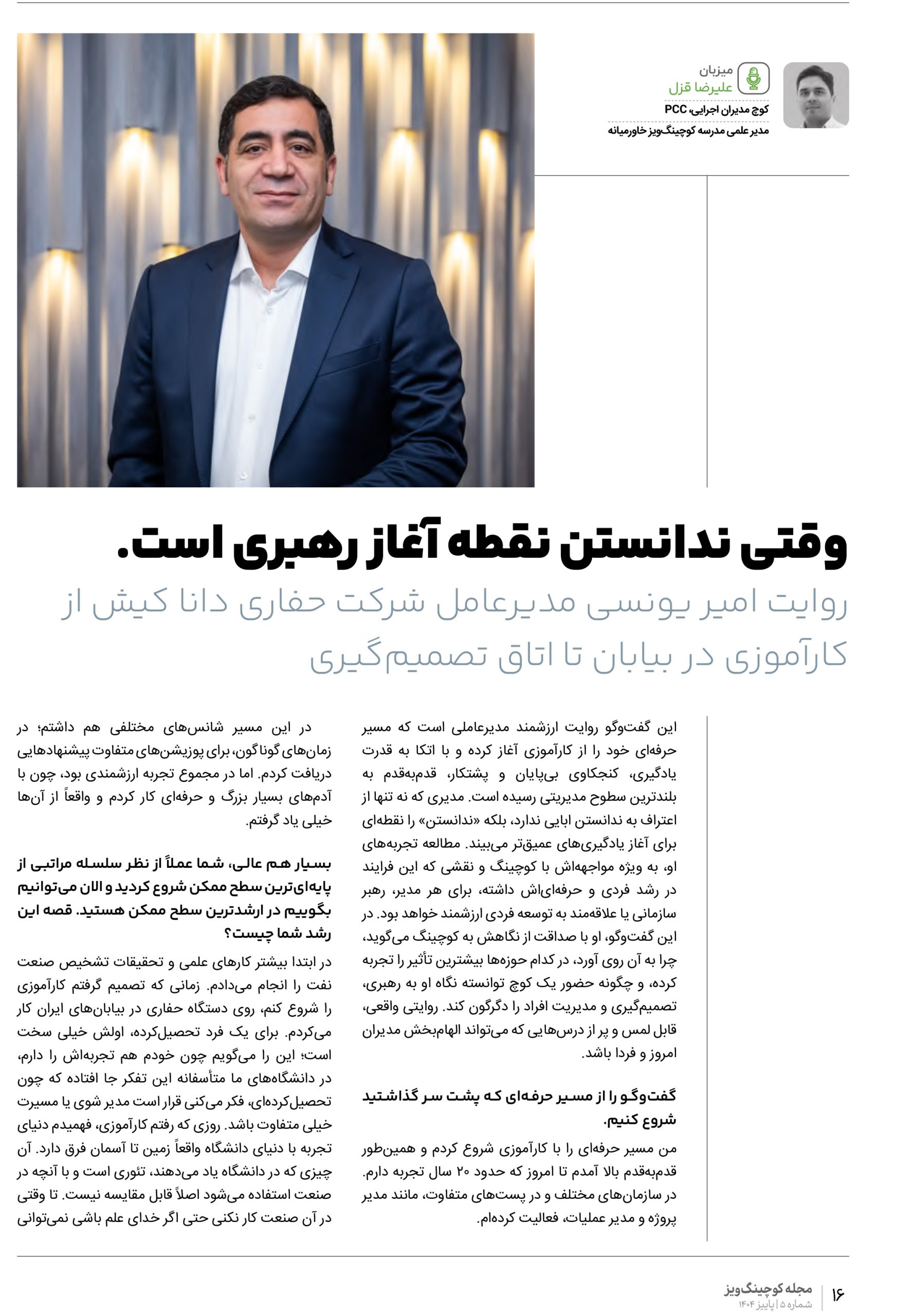 گفتگو با امیر یونسی مدیرعامل کسبوکار عملیات حفاری انرژی دانا، روایت ارزشمند مدیرعاملی است که مسیر حرفهای خود را از کارآموزی آغاز کرده و با اتکا به قدرت یادگیری، کنجکاوی بیپایان و پشتکار، قدم به قدم به بلندترین سطوح مدیریتی رسیده است. مدیری که نه تنها از اعتراف به ندانستن ابایی ندارد، بلکه «ندانستن » را نقطهای برای آغاز یادگیریهای عمیقتر میبیند. مطالعه تجربههای او، به ویژه مواجههاش با کوچینگ و نقشی که این فرایند در رشد فردی و حرفهایاش داشته، برای هر مدیر، رهبر سازمانی یا علاقهمند به توسعه فردی ارزشمند خواهد بود. در این گفتوگو، او با صداقت از نگاهش به کوچینگ میگوید؛ اینکه چرا به آن روی آورد، در کدام حوزهها بیشترین تأثیر را تجربه کرده و چگونه حضور یک کوچ توانسته نگاه او به رهبری، تصمیمگیری و مدیریت افراد را دگرگون کند. روایتی واقعی، قابل لمس و پر از درسهایی که میتواند الهامبخش مدیران امروز و فردا باشد.