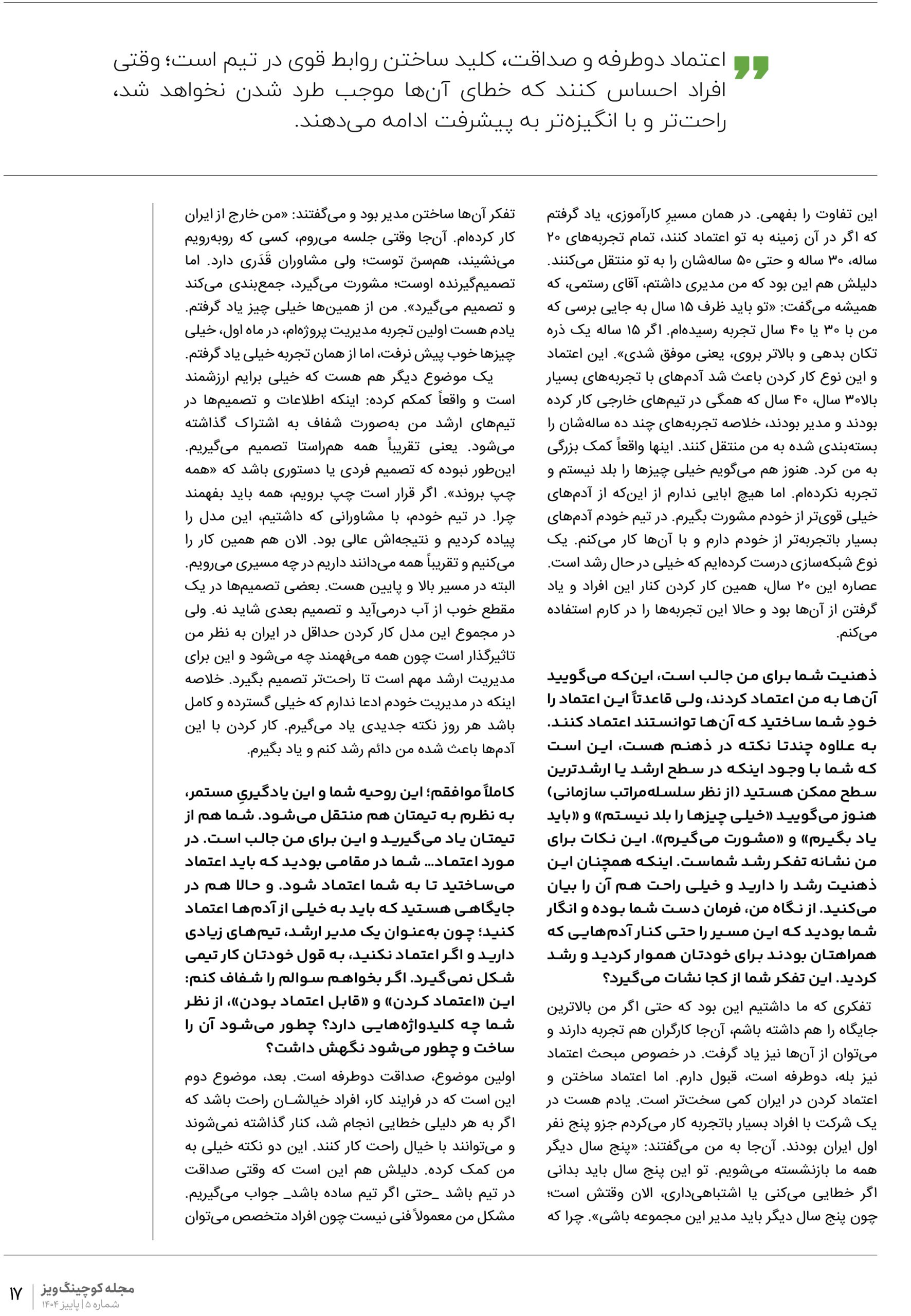 کاملاً موافقم؛ این روحیهی شما و این یادگیریِ مستمر، به نظرم به تیمتان هم منتقل میشود. شما هم از تیمتان یاد میگیرید و این برای من جالب است. در مورد اعتماد… شما در مقامی بودید که باید اعتماد میساختید تا به شما اعتماد شود، و حالا هم در جایگاهی هستید که باید به خیلی از آدمها اعتماد کنید؛ چون بهعنوان یک مدیر ارشد، تیمهای زیادی دارید و اگر اعتماد نکنید، به قول خودتان کار تیمی شکل نمیگیرد. اگر بخواهم سوالم را شفاف کنم: این «اعتماد کردن» و «قابل اعتماد بودن»، از نظر شما چه کلیدواژههایی دارد؟ چطور میشود آن را ساخت و چطور میشود نگهش داشت؟
